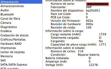 Si accedo a la información del sistema de mi Mac esto es lo que me aparece, y lo que mas llama la atención es la capacidad de plena carga que tiene ahora la batería 1771 comparada con la capacidad que debería tener que es 4100, lo cual supone menos del 50% de su capacidad original.